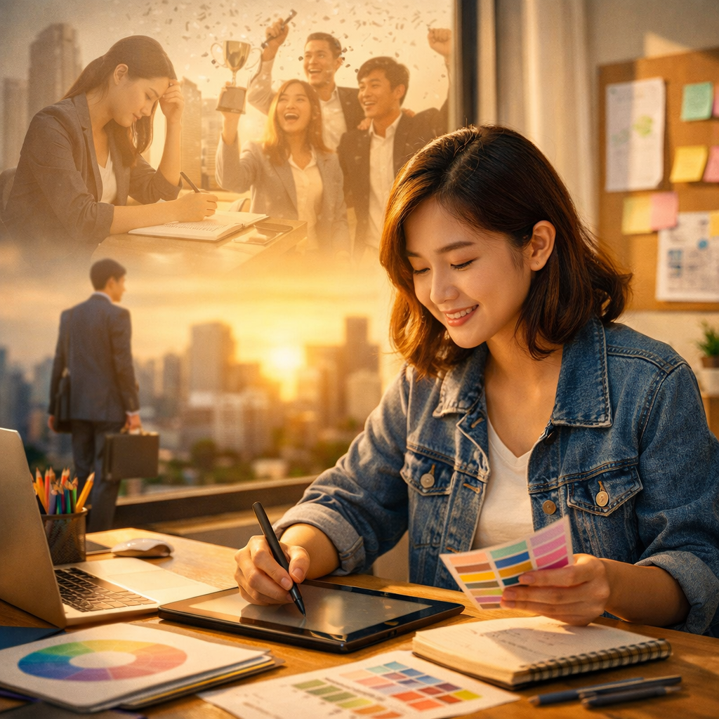 Minh Anh (27 tuổi, TP.HCM) từng tốt nghiệp ngành kế toán theo định hướng gia đình. Sau gần 3 năm đi làm, cô nhận ra bản thân không phù hợp với công việc văn phòng lặp lại mỗi ngày. Dù đã có công việc ổn định, Minh Anh quyết định nghỉ việc để theo học thiết kế đồ họa – một lĩnh vực hoàn toàn mới.